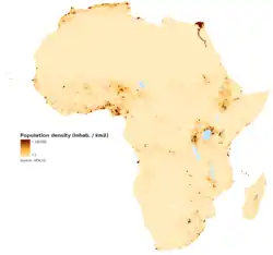 Der bevölkerungsreichste Staat ist Nigeria mit über 200 Millionen Einwohnern. Der bevölkerungsärmste Staat sind die Seychellen mit 80.000 Einwohnern. Der am dichtesten besiedelte Staat Afrikas ist Mauritius, und der am dünnsten besiedelte Staat ist Namibia.[14] Die größte Stadt Afrikas ist Kinshasa (16,3 Mio. Einwohner), gefolgt von Lagos (15,9 Mio. Einwohner) und der ägyptischen Hauptstadt Kairo (10,1 Mio. Einwohner). Die größte Agglomeration ist die ägyptische Metropolregion Kairo-Gizeh, gefolgt von Kinshasa in der DR Kongo und Lagos in Nigeria.