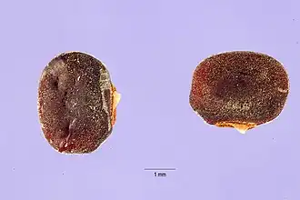 Die 20 bis 30 Zentimeter lange, leicht holzige, kahle und schmale, flache Hülsenfrucht enthält 20 bis 30 Samen. Die Samen sind bei einer Länge von etwa 3,2–8 Millimeter rundlich oder ellipsoid bis linsenförmig. Sie sind cremeweiß, beige oder orange-, dunkel- oder rotbraun bis schwarz und manchmal mit dunkler Marmorierung.