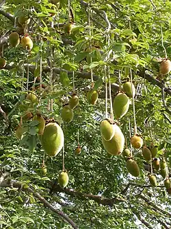 Nach der Bestäubung entwickeln sich an den langen Stielen innerhalb von acht Monaten holzige und samtig behaarte, nicht öffnende, vielsamige Kapseln, die je nach Verbreitungsgebiet unterschiedlich geformt sind. Bei in Angola verbreiteten Affenbrotbäumen ist die Frucht von länglicher Form, in den anderen natürlichen Verbreitungsgebieten eher ei- bis kugelförmig. Die an Stielen herabhängenden Früchte werden 25 bis 50 Zentimeter lang. Sie verfärben sich während des Reifungsprozesses von Grün über Gelb in ein Graubraun.