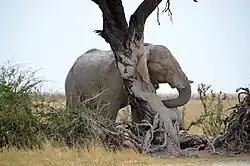 Das Öffnen waldreicher Landschaften hat aber auch zur Folge, dass diese Bereiche für andere Tierarten der Savannen wie Nashörner zugänglich werden und diese die neuen Refugien auch nutzen.[151] Andererseits kann eine zunehmende lokale Population des Afrikanischen Elefanten dazu verhelfen, künstlich veränderte Landschaften wieder in einen eher natürlichen Zustand zurückzuverwandeln.[152] In einem kleineren Maßstab dienen die beim Entrinden der Bäume oder beim Abbrechen von Ästen geschaffenen Hohlräume als Rückzugsorte für Kleinwirbeltiere. Dies kann mitunter einen bedeutenden Einfluss auf deren Bestand ausüben, wie es beispielsweise bei Geckos der Gattung Lygodactylus belegt wurde.[153] Des Weiteren haben die vom Afrikanischen Elefanten bei seinen Wanderungen angelegten Pfade eine große Bedeutung für andere Tierarten.[60][4]