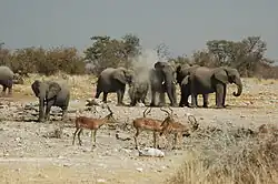 Prinzipiell ist der Afrikanische Elefant nicht territorial. Die Familiengruppen nutzen Aktionsräume, die je nach Habitat unterschiedlich groß sein können.[53] In feuchteren Landschaften wie im Lake-Manyara-Nationalpark in Tansania wurden Größen von 15 bis 52 km² bestimmt, in trockeneren Landschaften wie im Tsavo-East- und Tsavo-West-Nationalpark in Kenia erreichen die Aktionsräume Ausdehnungen von 350 bis 1580 km², im Kruger-Nationalpark in Südafrika zwischen 1600 und 4000 km². Die größten Aktionsräume haben Tiere in wüstenartigen Landschaften wie im Zakouma-Nationalpark im Tschad mit einer Fläche von knapp 4700 km², im Etosha-Nationalpark in Namibia mit 5800 bis 8900 km² oder in der Kunene-Region, ebenfalls Namibia, mit bis zu 12.800 km².[54][55][56] Die Junggesellengruppen der Bullen haben durchschnittlich größerer Aktivitätsgebiete als die Familiengruppen der Kühe, in den absoluten Ausmaßen gibt es aber kaum Unterschiede zwischen den Geschlechtern. Des Weiteren variiert die Ausdehnung mit der Jahreszeit, so dass die Aufenthaltsgebiete in der Regenzeit größer sind als in der Trockenzeit. Innerhalb der Aktionsräume bestehen verschiedene Zonen, die jahreszeitlich wechselnd genutzt werden. Die einzelnen Herden wandern im Jahreszyklus zwischen den Aufenthaltsgebieten und legen dabei täglich durchschnittlich 5 bis 13 km zurück mit kürzeren Distanzen während der Trockenzeit. Die Populationen aus der Gourma-Region in Mali bewältigen dadurch jährlich etwa 3900 km. Die Herden wandern in einem jährlichen kreisförmigen Zyklus, der sie in der Trockenzeit zu den Wasserstellen im Norden führt. Mit der herannahenden Regenzeit sind die Wanderungen dann wieder südwärts gerichtet, was mit der größeren verfügbaren Nahrungsmenge erklärbar ist.[57] Im südlichen Afrika wechseln die Herden jährlich zwischen dem Kruger-Nationalpark und dem angrenzenden Sabi Sand Reserve. In beiden Schutzgebieten nutzen sie Kernzonen in relativer Wassernähe, wobei die Tiere sich selten weiter als 3 km von der nächsten Wasserstelle aufhalten. Ihre täglichen Wanderungen belaufen sich im Minimum auf rund 4, im Maximum auf 44 km.[56][1][4]