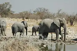 Extrem wichtig für den Afrikanischen Elefanten ist Wasser, von dem er täglich bis zu 160 l benötigt. Die Abhängigkeit von Wasser kann ihn vor allem in der Trockenzeit auch in weniger gut geeignete bis hin zu degradierten Landschaften führen. Höchstwahrscheinlich ist dies ein Grund für die teils weiten, jahreszeitlich bedingten Wanderungen bei einigen Populationen. Unter Umständen trinken die Tiere bei Nichtverfügbarkeit von Süßwasser auch Brackwasser, das aber gesundheitsschädlich sein kann. Die wüstenbewohnenden Vertreter, aber ebenso die anderer Regionen, graben mit ihren Füßen und mit dem Rüssel Löcher von bis zu 1 m Tiefe, um an oberflächennahes Wasser zu gelangen. Dies geschieht teilweise auch in unmittelbarerer Nähe zu Süßwasser. Die Wasserlöcher ziehen wiederum andere Tiere der Umgebung an. Mitunter nutzt der Afrikanische Elefant künstliche Wasserreservoirs und kann dabei die vom Menschen angelegte Infrastruktur zur Wasserversorgung zerstören.[103] Daneben spielen Salzlecken und mineralhaltige Böden eine wichtige Rolle. Diese dienen teilweise dazu, um toxische Bestandteile in Pflanzen zu neutralisieren.[104] Darüber hinaus gleichen die Tiere damit natriumarme Pflanzenkost aus, die unter anderem in trockenen Gebieten oder während der Trockenzeit hauptsächlich zur Verfügung steht. Dabei nutzen dies gemäß Untersuchungen im Hwange-Nationalpark Kühe intensiver als Bullen und verbringen so einen größeren Teil ihres aktiven Zeitbudgets. Die verstärkte Geophagie bei weiblichen Tieren hängt hauptsächlich mit den höheren energetischen Kosten beim Austragen des Nachwuchses zusammen.[105][106] Teilweise bricht der Afrikanische Elefant Termitenhügel auf, um an mineralhaltiges Bodenmaterial zu gelangen.[107][1][4]