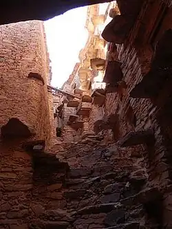 Über eine Eingangspforte gelangt man in einen Vorhof mit einem kleinen Häuschen für den oder die Wärter. Der eigentliche Zugang ins Innere der Speicherburg führt vorbei an den – in vielen Agadiren anzutreffenden – gegenüberliegenden Steinbänken. Ein von Speicherkammern überdeckter Durchgang führt in den hinteren Bereich, wo die einzelnen Kammern in bis zu fünf Stockwerken übereinander angeordnet sind. Insgesamt sind es mehr als 300 ca. 1,50 m bis 1,70 m hohe Speicherkammern, die über aus dem Bruchsteinmauerwerk vorkragende Trittsteine erreichbar sind.