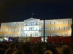 - ↑ Στους 100.000 οι «Αγανακτισμένοι στο Σύνταγμα», skai.gr, 29. Mai 2011; Greece set for severe bail-out condition, CNN, 30. Mai 2011; Spanish inspired protest grips athens ( des vom 3. April 2017 im Internet Archive) Info: Der Archivlink wurde automatisch eingesetzt und noch nicht geprüft. Bitte prüfe Original- und Archivlink gemäß Anleitung und entferne dann diesen Hinweis., Euronews, 29. Mai 2011; Λαοθάλασσα βούλιαξε το Σύνταγμα!, protothema.gr, 30. Mai 2011.