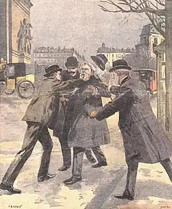 „Tätlicher Angriff auf Herrn Fallières. Der Kellner Mattis stürzt sich auf den Präsidenten.“