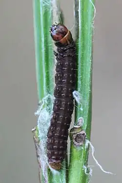 Die Falter erreichen eine Flügelspannweite von 15 bis 21 Millimetern.[1] Sie besitzen eine ockerfarbene Grundfärbung und eine dunkelbraune bis schwarze Zeichnung. Die Flügel werden in Ruhestellung flach und überlappend zusammengelegt. Die Falter sind schwierig von verwandten Arten zu unterscheiden.