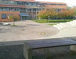 Ein Teil des Schulhofs ist architektonisch einem antiken Amphitheater nachempfunden.[5]