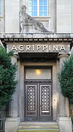 Der Firmenname ist auf die in Köln geborene Agrippina die Jüngere, die Mutter Kaiser Neros, zurückzuführen. 1901 brachte die Agrippina-Versicherung als erste Gesellschaft in Deutschland eine „Fahrzeug-Unfall-Versicherung“ auf den Markt, die vom Umfang her bereits der heutigen Kaskoversicherung entsprach.[2] Die Agrippina dehnte ihr Geschäft auf weitere Versicherungsarten aus. 1838/39 entstand eine Feuerversicherung, die 1841 in „Colonia Feuerversicherung“ umbenannt wurde. 1872 gründete sie den Rückversicherungsverein Agrippina, der 1906 in Kölner Lloyd umfirmierte und 1921 den Düsseldorfer Lloyd übernahm. Im Jahre 1914 zog sie in einen von Schreiterer & Below geplanten neoklassizistischen Bau auf der Riehler Straße 90,[3] der 1930 aufgestockt wurde. 1921 gründete sie die Warenhausversicherung Patria Versicherungs-AG für Handel und Industrie.[4] Durch Unternehmenskäufe wuchs die Agrippina weiter. Übernommen wurden 1940 die Bavaria Versicherungs-AG, 1941 die Central Krankenversicherung und 1960 die Mitteleuropäische Versicherungs-AG. Das Kölner Bankhaus Delbrück & Co besaß (über seine persönlich haftenden Gesellschafter Ludwig-Theodor von Rautenstrauch und Axel Momm) mit rund 75 % die Mehrheit der Aktien der aus sechs Gesellschaften bestehenden Agrippina-Gruppe.