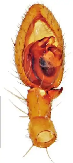 Der Carapax (Rückenschild des Prosomas, bzw. Vorderkörpers) hat eine hellbräunliche Färbung mitsamt einigen dunkelbraunen undeutlichen, zusammenlaufenden Markierungen. Lateral (am Rand) ist er dunkelbraun gefärbt. Die Cheliceren (Kieferklauen) erscheinen hellbraun. Das Sternum (Brustschild des Prosomas) hat eine gelbbraune Farbgebung mit einer rötlichen Tönung. Die Beine und Pedipalpen (umgewandelte Extremitäten im Kopfbereich) sind hellbraun gefärbt. Dorsal (oben) besitzt das Opisthosoma (Hinterleib) eine hellbraune Grundfärbung und anterior (vorne) dunklere Punkten und einen undeutlichen medianen (mittleren) Fleck sowie posterior (hinten) gelegentlich bräunlichen Winkelflecken.[3]