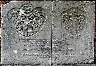 Epitaph an der Kirche St. Laurentii in Itzehoe. Inschrift: FRAU MARGARETA CATHARINA VON AHLEFELD ABTISSIN FRAULEIN EMERENTIA VON AHLEFELD CONVENTUALIN FRAU METTA CHRISTINA VON AHLEFELD ABTISSIN GESCHWISTER AUS DEM HAUSE KÖNIGSFERDE ANNO 1728