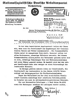 Während der Zeit des Nationalsozialismus konnte sich die Gemeinde nicht organisiert halten und begann erst nach dem Krieg mit dem Wiederaufbau.[60] Einige Missionare kehrten wieder nach Indien zurück, die anderen wichen nach England aus. Die „Islamische Gemeinde Berlin“ beziehungsweise die „Berliner Moschee“ wurde von deutschen Muslimen weiter betreut. Seit dem 22. März 1930 führte die Moscheegemeinde den Namen Deutsch-Muslimische Gesellschaft e. V. Mit dieser Umbenennung war ein ungewöhnliches Programm verbunden: Die neue Gemeinschaft nahm auch Christen und Juden als Mitglieder auf, was für die damalige Zeit ungewohnt war.[61] Doch genau das wurde der Gemeinschaft mit ihrer Moschee am Fehrbelliner Platz in der Zeit des Nationalsozialismus zum Verhängnis, denn die Nationalsozialisten sahen in der „Deutschen Muslimischen Gesellschaft e. V.“ einen „Zufluchtsort für Kurfürstendammjuden“.[62] Nach dem Tod des syrischen Studenten Muhammad Nafi Tschelebi im Sommer 1933 führte die Deutsch-Muslimische Gesellschaft nur noch ein Schattendasein.[63] Den Nationalsozialisten gelang es in der Folge, die islamische Gemeinde zu instrumentalisieren und die Moschee für Propagandaauftritte mit Mohammed Amin al-Husseini zu missbrauchen, z. B. anlässlich des Opferfestes im Jahr 1942.[64] Im Jahre 1962 wurde die Deutsch-Muslimische-Gesellschaft von der AAIIL wiederbelebt und hat heute ihren Sitz in der Wilmersdorfer Moschee in Berlin.[65]