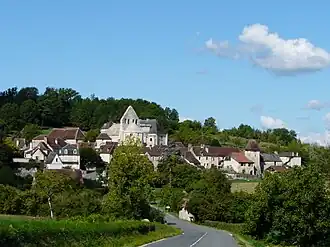 - Das heute zwei-, ehemals dreijochige Schiff der ehemaligen Burgkirche Saint-Martin aus dem 12. und 13. Jahrhundert sollte von zwei Kuppeln gedeckt werden, die jedoch nicht vollendet wurden oder einstürzten. Die außen polygonal ummantelte, im Innern aber halbrunde Apsis, über der sich ein wahrscheinlich später hinzugefügter viergeteilter Glockengiebel erhebt, hat drei Fenster, die durch eine auf Säulen ruhenden Blendbogenstellung optisch hervorgehoben werden. Zur Zeit der Templer wurde die Apsis um ein Wehrgeschoss erhöht. Auf der Südseite der Kirche wurden bei Ausgrabungsarbeiten mehrere merowingische Sarkophage freigelegt. Der Kirchenbau wurde im Jahr 1925 als Monument historique eingeschrieben.[10]