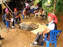 - – das Opfern von Tieren: Dabei wird einem Wasserbüffel ein angespitzter Holzpfahl in den Hals gerammt, um ihn zu töten. Anschließend wird er mit Macheten geschlachtet und von den Dorfbewohnern verspeist. Dazu wird viel Whiskey getrunken.