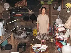 Die Basis jeder Mahlzeit ist Reis. Dazu werden Eintöpfe, Gemüsebeilagen, Bambus und selbstgemachte Soßen aus Chili serviert. Ab und zu gibt es auch Huhn, Schwein, Fisch und auch Käfer. Dabei werden nach Möglichkeit alle Körperteile der Tiere verzehrt, samt Kopf und Knochen. Wie in Asien üblich essen sie mit den Händen oder mit Stäbchen. Suppen löffeln sie aus einer gemeinsamen Schüssel. Gegessen wird auf dem Boden auf einem Tischchen aus Bambus. Sehr gerne wird auch der selbstgebrannte Whiskey (Dschibbá) zu den Mahlzeiten getrunken. Er ist auch fester Bestandteil gesellschaftlicher Aktivitäten, Abende und Feste.
