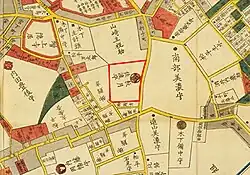 - ↑ Ausschnitt aus der Stadtteilkarte „Azabu“ von ca. 1850.