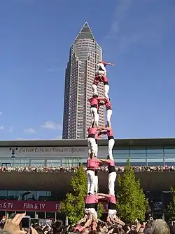 Castell in der Formation 3de8 Tres de Vuit der Colla Vella dels Xiquets de Valls am 13. Oktober 2007 vor dem Messeturm in Frankfurt