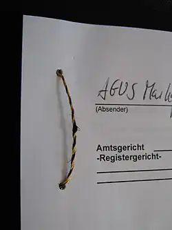 Eine Aktenschnur wird zum Teil für notarielle Verträge oder für Grundbuchauszüge mit speziellen farbigen Aktenschnüren oftmals mit Papiersiegeln verwendet.