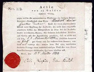 Die älteste bekannte bayerische Aktie, von der Bürger-Ressource-Gesellschaft in Hof, 1804.