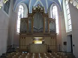 Der Innenraum des Erdgeschosses des Chorflankenturms ist mit einem Kreuzrippengewölbe überspannt, der des Langhauses mit einer Kassettendecke, der des Chors mit einem Stichkappengewölbe. Die Orgel wurde 1976 als Opus 951 von der Giengener Orgelmanufaktur Gebr. Link in den Prospekt von 1851 eingebaut.[1]