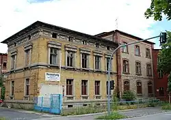 An die Villa schließt ein dreigeschossiger, aus Natursteinen errichteter Fabrikteil an, dessen Fenster durch Ziegelsteine eingefasst sind.