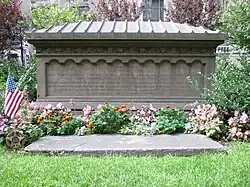 Gallatin verbrachte den Lebensabend von seiner Familie umgeben in der Bleecker Street 57 in New York als Elder Statesman. Aufmerksamkeit zog er nochmals in der Kontroverse um die Second Bank of the United States auf sich, die der populistische Präsident Andrew Jackson schwor zu „töten“. Mit dem zunächst im Dezember 1830 im American Quarterly Review veröffentlichten und im Februar des nächsten Jahres erweiterten Essay Considerations on the Currency and Banking System of the United States verteidigte Gallatin das Konzept einer Nationalbank. Während der Nullifikationskrise stellte sich Gallatin privat auf die Seite Jacksons: Man müsse die Nullifikationsdoktrin nullifizieren.[40] Von 1829 bis 1839 war er Präsident der neu gegründeten National Bank of New York. Während der Wirtschaftskrise von 1837 unterstützte er andere Banker beim Bekämpfen der Krise. Auch verteidigte er den Freihandel vor dem protektionistischen Henry Clay, der sich im Kongress mit xenophobischen Angriffen revanchierte. In seinen letzten Jahren stellte er sich in Essays wie dem Bestseller Peace with Mexico (1847), wovon 90.000 Kopien verkauft wurden, und dem Essay War Expenses gegen den Mexikanisch-Amerikanischen Krieg. Er verstarb am 12. August 1849 und wurde auf dem Friedhof der Trinity Church begraben.[41]