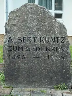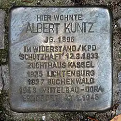 Kuntz wurde aber nicht freigelassen, sondern im KZ Lichtenburg in „Schutzhaft“ genommen. Ein neuerliches Verfahren wegen Vorbereitung zum Hochverrat endete im April 1935 mit einer Verurteilung zu 15 Monaten Zuchthaus, die er in der Justizvollzugsanstalt Kassel I absaß. Anschließend nahm man ihn erneut in Schutzhaft und brachte ihn zurück ins KZ Lichtenburg. Hier arbeitete er beim Bau von Heiz- und Badeanlagen. Gemeinsam mit Theodor Neubauer und Walter Stoecker baute Albert Kuntz in Lichtenburg die illegale Organisation der KPD auf.[2] Nach Auflösung des KZ Lichtenburg wurde er im KZ Buchenwald in ähnlicher Funktion eingesetzt. Hier stieg er zum Verantwortlichen für Be- und Entwässerung auf und organisierte wieder gemeinsam mit Walter Stoecker und Theodor Neubauer die illegale KPD-Gruppe im Lager. Nach einer mehrmonatigen Haft im „Bunker“ wurde er in eine Außenstelle des KZ Buchenwald nach Kassel verlegt, wo er wiederum in der Be- und Entwässerung tätig war. Im September 1943 brachte man ihn in das neu errichtete KZ Mittelbau-Dora bei Nordhausen. Unter dem Kommando von Otto Förschner war er auch hier Funktionshäftling in der Bauleitung und koordinierte Sabotageakte einer illegalen Gruppe an den V-Waffen, die dort hergestellt wurden. Im November 1944 versuchte die SS vergeblich, ihm Informationen über die Sabotage abzupressen. In der Nacht vom 22. zum 23. Januar 1945 starb Kuntz während eines Verhörs.
