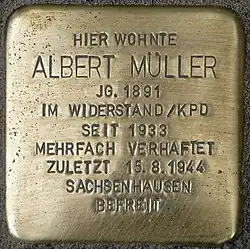 Albert Müller war gelernter Schlosser und vielseitig gebildet. Viele Jahre war er Vorsitzender der Freien Schulgesellschaft. Noch im März 1933, zwei Monate nach der „Machtergreifung“ durch die Nationalsozialisten, kandidierte er auf der Liste der KPD für die Solinger Stadtverordnetenversammlung.