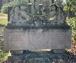 - ↑ Kurz vor seiner Einberufung hatte Rudolf Pantle noch zwei Aufsätze veröffentlicht über eine Ausstellung für Friedhofkunst im Hoppenlau-Friedhof in Stuttgart, die 1914 stattgefunden hatte (#Pantle 1914.1, #Pantle 1914.2). Das spätere Grabmal der Familie wurde damals ausgestellt (Abbildung: #Pantle 1914.1, Seite 67) und von Pantle übernommen.