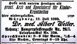 Weiler eröffnete am 12. Juli 1895 die erste allgemein- und kinderärztliche Praxis in der Haugerpfarrgasse, nachdem das Juliusspital Mitte des 19. Jahrhunderts eine eigene Kinderklinik gegründet hatte.