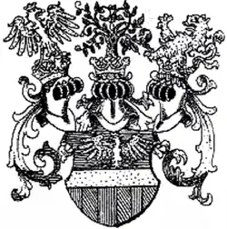 1774: Schild quergeteilt durch einen güldenen Balken; oben ein rechtssehender silberner, goldgewaffneter und gekrönter Adler mit ausgebreiteten Flügeln in Blau; unten von Rot und Grün sechsmal der Länge nach geteilt. Über der Grafenkrone drei gekrönte Helme; der rechte Helm trägt den Adler, der mittlere einen befruchteten Lorbeerbaum und der linke einen gekrönten goldenen einwärtsspringenden Löwen. Die Decken des rechten Helmes sind blau und silbern, die des mittleren grün und silbern und die des linken rot und golden. Den Schild ballen zwei auswärtssehende goldene gekrönte Löwen. — Im Wappenbuch der österreichischen Monarchie steht in dem oberen Teil des Schildes in Silber ein schwarzer, goldbewehrter Adler und in dem unteren in Grün drei rote Pfähle.