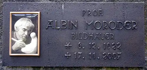 Albin Moroder war bis zu seinem Tode noch schöpferisch tätig und überreichte in einer Privataudienz im November 2005 Papst Benedikt XVI. ein Kruzifix. Morodors Grab befindet sich auf dem Waldfriedhof Mayrhofen.