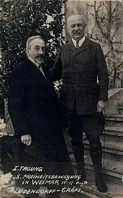 Trotzdem versuchte Ludendorff zusammen mit Graefe, vortäuschend auch für Hitler zu sprechen, die NSDAP und DVFP als Partei und nicht nur als Fraktion zu einen. Ludendorff, Graefe und Strasser riefen im Oktober 1925, nach einer Konferenz in Weimar vom 15. bis zum 17. August, dann auch die Nationalsozialistische Freiheitsbewegung (NSFB bzw. NF) als gemeinsame Partei aus.[20][8] Die Partei löste sich jedoch nach nationalsozialistischem Widerstand im 14. Februar 1925 bereits wieder auf, indem Ludendorff, Graefe und Strasser die Führung niederlegten.[21]