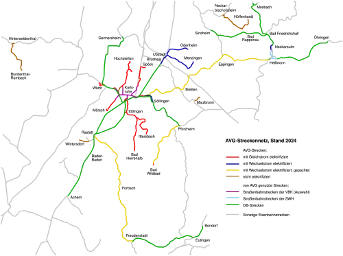 Neben mehreren Strecken, die von der Stadtbahn Karlsruhe befahren werden, betreibt die AVG die 15 Kilometer lange pfälzische Wieslauterbahn von Hinterweidenthal Ost nach Bundenthal-Rumbach. Dort führt DB Regio saisonal Personenverkehr durch.