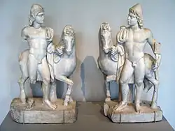 Die göttlichen Zwillinge, von denen der eine sterblich und der andere unsterblich ist, gehen noch auf die Mythenwelt der Indogermanen zurück. Sie gelten als pferde- oder vogelgestaltige Kinder des Himmelsgotts und befreien oder umwerben die jungfräuliche Tochter der Sonne.[6] Sie stellen keine Naturgewalt dar, führen aber die Sonne über den Himmel.[3] Allgemein wurden sie als Retter und Schützer verehrt.[6] Einen hohen Stellenwert hatten sie nicht nur bei den Griechen und Römern, sondern auch bei den Indern und Balten, während sie bei den Kelten und Germanen nur noch schattenhaft in Erscheinung treten.[6] Neben den Alcis können in der germanischen Überlieferung noch die legendären, fast mythischen Stammesanführer Ibur und Aio beziehungsweise Aggi und Ebbi bei den Langobarden, Raos und Raptos bei den Wandalen[7] und die anglischen Brüder Hengest und Horsa,[8] bei denen sogar noch deutlich im Namen eine Pferdegestalt durchscheint,[9] mit den Dioskuren verglichen werden.