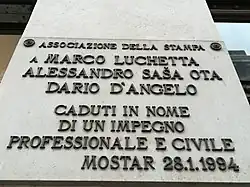- ↑ Giornalisti: a Trieste giardino in memoria vittime Mostar. Cerimonia con Siddi e Rossi (Fnsi) per Luchetta, Ota, D’Angelo, Hrovatin. Articolo 21, liberi di…, 12. Mai 2014, abgerufen am 26. Januar 2019.