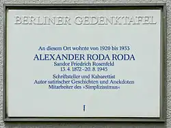 Alexander Friedrich Ladislaus Roda Roda, Geburtsname Sándor Friedrich Rosenfeld (* 13. April 1872 in Drnowitz bei Wischau, Mähren, Österreich-Ungarn; † 20. August 1945 in New York), war ein österreichischer Schriftsteller, Satiriker und Publizist. Er bezeichnete sich selbst einmal als „Dichter Österreich-Ungarns“.[1] Sein Werk besteht großteils aus humoristischen bzw. satirischen Erzählungen und Romanen, in welchen er in liebevoll-nachsichtiger Weise die Schwächen und Kuriositäten der Donaumonarchie und besonders des k. u. k. Offizierskorps aufs Korn nahm.[2]