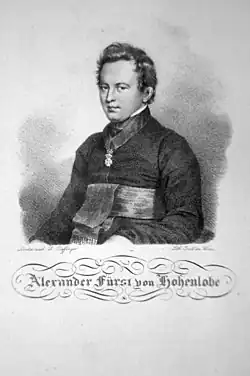 Nach einer theologischen Ausbildung erhielt er 1815 die Priesterweihe. Die Primizpredigt hielt ihm Johann Michael Sailer. Ein Jahr später trat er dem Malteserorden bei. Ein weiteres Jahr später wurde er am 15. Juli 1817 durch die Gunst des Königs Maximilian I. sowohl zum Geistlichen Rat als auch zum Domkapitular beim Vikariat Bamberg bestimmt.[3] 1819 zum bischöflichen Vikar ernannt, wurde er 1821 Kapitular von Bamberg und glaubte im selben Jahr durch Gebete, an einem Bauern eine Wunderheilung vollbracht zu haben.[4] Er versuchte sich danach weiter in dieser in Form angeblich wundertätigen Gebetstherapien bzw. Fernheilungen[5] praktizierten Tätigkeit in Bamberg und im Juliusspital von Würzburg (etwa die Scheinheilung der jungen Prinzessin Mathilde von Schwarzenberg,[6] die wegen einer rechtskonvexen Skoliose[7] Patientin von Cajetan von Textor und Johann Georg Heine war), wo schon unter dem Fürstbischof Philipp von Dembach der Pater Marcus de Curano Wunderheilungen durchgeführt haben soll.[8] sowie in Bad Brückenau. Hier glaubte auch Ludwig I. von Bayern, durch Hohenlohe von seiner Schwerhörigkeit geheilt worden zu sein.[9] Vom Volk verehrt, aber des Jesuitismus und Obskurantismus bezichtigt, hatte er in Bamberg gegen den Bürgermeister Franz Ludwig von Hornthal anzukämpfen, der schließlich dem Handeln Hohenlohes ein Ende bereitete, was in der Bürgerschaft von Bamberg mit gemischten Gefühlen aufgenommen wurde und Hornthals Wiederwahl vereitelte.[10]