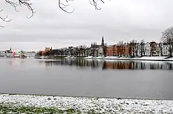 Der 12 Hektar große Pfaffenteich entstand durch Aufschüttung eines Dammes (später teilweise der Spieltordamm) wahrscheinlich schon kurz nach der Stadtgründung im 12. Jahrhundert als Mühlenteich für eine 1178 belegte Wassermühle. Die gräfliche Mühle war bis ins 19. Jahrhundert in Betrieb. Am Aubach stand eine zweite Mühle im Besitz des Domkapitels (Bischofsmühle), die bis 1914 im Betrieb war.