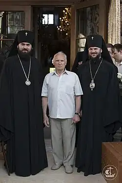 Von links: Erzbischof Feofilakt von Smolensk, Alexei Ossipow und Erzbischof Amwrossi von Peterhof, seit 2020 Erzbischof von Twer. Das Bild entstand 2014 im Dreifaltigkeitskloster von Sergijew Possad bei der Feier zum 700. Jahrestag der Geburt des Heiligen Sergius von Radonesch
