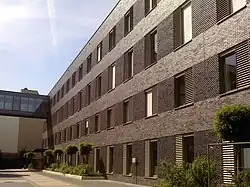 Ein gläserner Fußgängerübergang verbindet dieses Gebäude mit dem Südflügel des Haupthauses. Das Flachdach des Neubaus ist mit Moosen und Flechten begrünt.