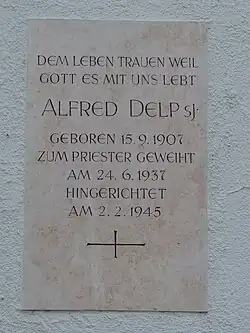 Die Jugend von Alfred Delp wurde dann vor allem durch den katholischen Jugendverband „Bund Neudeutschland“ („ND“) geprägt. Unmittelbar nach seinem Abitur an der Goetheschule in Dieburg trat er 1926 in den Jesuitenorden ein. Während seines Studiums war der spätere Theologe des II. Vaticanums, Karl Rahner, sein Lateinlehrer.[2] Als Erzieher und Lehrer wirkte Delp am Kolleg St. Blasien im Schwarzwald. 1937 wurde er zum Priester geweiht. Seit 1939 wirkte er als Seelsorger in der Pfarrei Heilig Blut im Münchner Stadtteil Bogenhausen.[3] Er wurde Mitarbeiter der Zeitschrift Stimmen der Zeit in München, der im Juni 1941 die Druckerlaubnis entzogen wurde, bis sie im Oktober 1946 wieder erscheinen konnte.