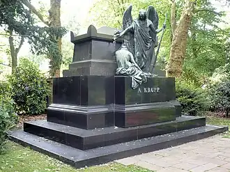 1887 starb Alfred Krupp 75-jährig an einem Herzinfarkt. Er wurde auf dem damaligen Friedhof am Kettwiger Tor an der Hohenburgstraße in Essen beigesetzt. Wegen Erweiterung des Bahnhofsvorplatzes 1910 wurde das Grab an die Freiheit südlich des Hauptbahnhofes verlegt. 1955 zwangen kommunale Baumaßnahmen erneut zu einer Verlegung der Grabstätte. Sie befindet sich seitdem auf dem städtischen Friedhof Bredeney an der Westerwaldstraße in Essen.