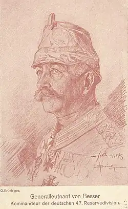 Zu Beginn des Ersten Weltkriegs als z.D.-Offizier wiederverwendet, erhielt Besser das Patent zu seinem Dienstgrad und wurde am 11. November 1914 zum Kommandeur der 47. Reserve-Division ernannt.[2] Zunächst lag er mit seinem Großverband noch in Kämpfe zwischen Maas und Mosel. Ab 20. November 1914 verlegt die Division nach Krakau und griff ab 5. Dezember in die Kämpfe um Limanowa-Lapanow ein. Es folgten Stellungskämpfe an unteren Dunajek. Für die Erfolge seiner Division in der Schlacht bei Gorlice-Tarnów wurde Besser mit dem Roten Adlerorden II. Klasse mit Eichenlaub und Schwertern ausgezeichnet.[3] Daran schlossen sich weitere Kämpfe an der Ostfront an, bis Besser die Division im April 1917 abgab und dafür das Kommando über die 3. Landwehr-Division übernahm. Er führte sie über die Waffenruhe sowie den Waffenstillstand an der Ostfront hinaus und beteiligte sich an der Besetzung der Ukraine. Am 23. September 1918 wurde Besser Kommandeur der 205. Infanterie-Division[4], mit der er sich an der Besetzung von Livland und Estland beteiligte. Nach dem Waffenstillstand von Compiègne und der Räumung der Gebiete wurde Besser am 18. Dezember 1918 von seinem Kommando entbunden und in den Ruhestand verabschiedet.