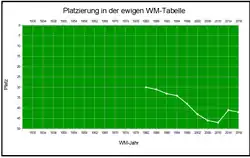 | 13 WM-Spiele 3 Siege 3 Unentschieden 7 Niederlagen 13:19 Tore | |