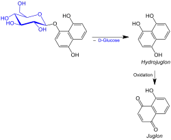 Ein klassisches Beispiel für allelopathische Wirkung ist die vom Echten Walnussbaum (Juglans regia) abgegebene Substanz Juglon. Diese gelangt von den Blättern des Baumes über Auswaschung in den Boden. Die zunächst inaktive Form wird dort von Bodenmikroben umgewandelt und in ihre aktive Form überführt. Juglon wirkt bereits in sehr geringen Konzentrationen hemmend auf die Keimung anderer Pflanzen.