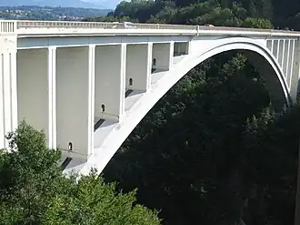 Der Straßenverkehr wird über die 1925 bis 1928 erbaute Spannbogen-Brücke Pont Caquot geleitet.