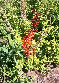 Der Blütenstand ist einfach oder weist ein bis zwei Zweige auf. Er erreicht eine Länge von 35 bis 40 Zentimeter (selten bis 50 Zentimeter). Die ziemlich dichten bis dichten, zylindrischen, leicht spitz zulaufenden Trauben sind 10 bis 20 Zentimeter lang und 4 Zentimeter breit. Die linealisch-deltoiden, spitz zulaufenden Brakteen weisen eine Länge von etwa 5 Millimeter auf. Die gelben oder roten und gelb gespitzten Blüten stehen an 3 bis 5 Millimeter langen Blütenstielen. Die Blüten sind 11 bis 15 Millimeter lang und an ihrer Basis kurz verschmälert. Oberhalb des Fruchtknotens sind sie sehr leicht verengt und schließlich zur Mündung erweitert. Ihre Perigonblätter sind auf einer Länge von etwa 3 bis 6 Millimetern nicht miteinander verwachsen. Die Staubblätter und der Griffel ragen 4 bis 6 Millimeter aus der Blüte heraus.