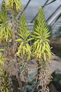 Der Blütenstand ist einfach oder besteht aus bis zu fünf Zweigen. Er erreicht eine Länge von 1 bis 2 Meter. Die ziemlich dichten, zylindrisch Trauben sind 35 bis 40 Zentimeter lang. Die eiförmig spitz zulaufenden Brakteen weisen eine Länge von 10 bis 15 Millimeter auf und sind 6 Millimeter breit. Die roten oder gelben Blüten stehen an 5 bis 10 Millimeter langen Blütenstielen. Die Blüten sind etwa 30 Millimeter lang und an ihrer Basis gerundet. Auf Höhe des Fruchtknotens weisen die Blüten einen Durchmesser von 8 Millimeter auf. Darüber sind sie leicht verengt und dann zur Mündung leicht erweitert. Ihre äußeren Perigonblätter sind auf einer Länge von 10 bis 16 Millimetern nicht miteinander verwachsen. Die Staubblätter und der Griffel ragen 2 bis 3 Millimeter aus der Blüte heraus.