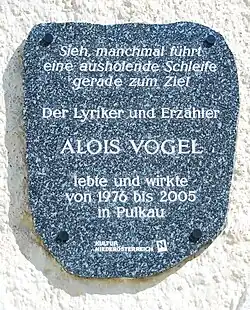 - Festveranstaltung anlässlich der Enthüllung einer Gedenktafel für den Schriftsteller Professor Alois Vogel. In: Pulkau aktuell. Information der Stadtgemeinde Pulkau, Sommer 2007 (Folge 68), S. 7, pdf online, abgerufen am 1. Dezember 2010.