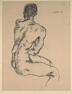 - Männlicher sitzender Akt von rückwärts, Kreide, Bleistift, 56,2 × 42,2 cm, Albertina[2]